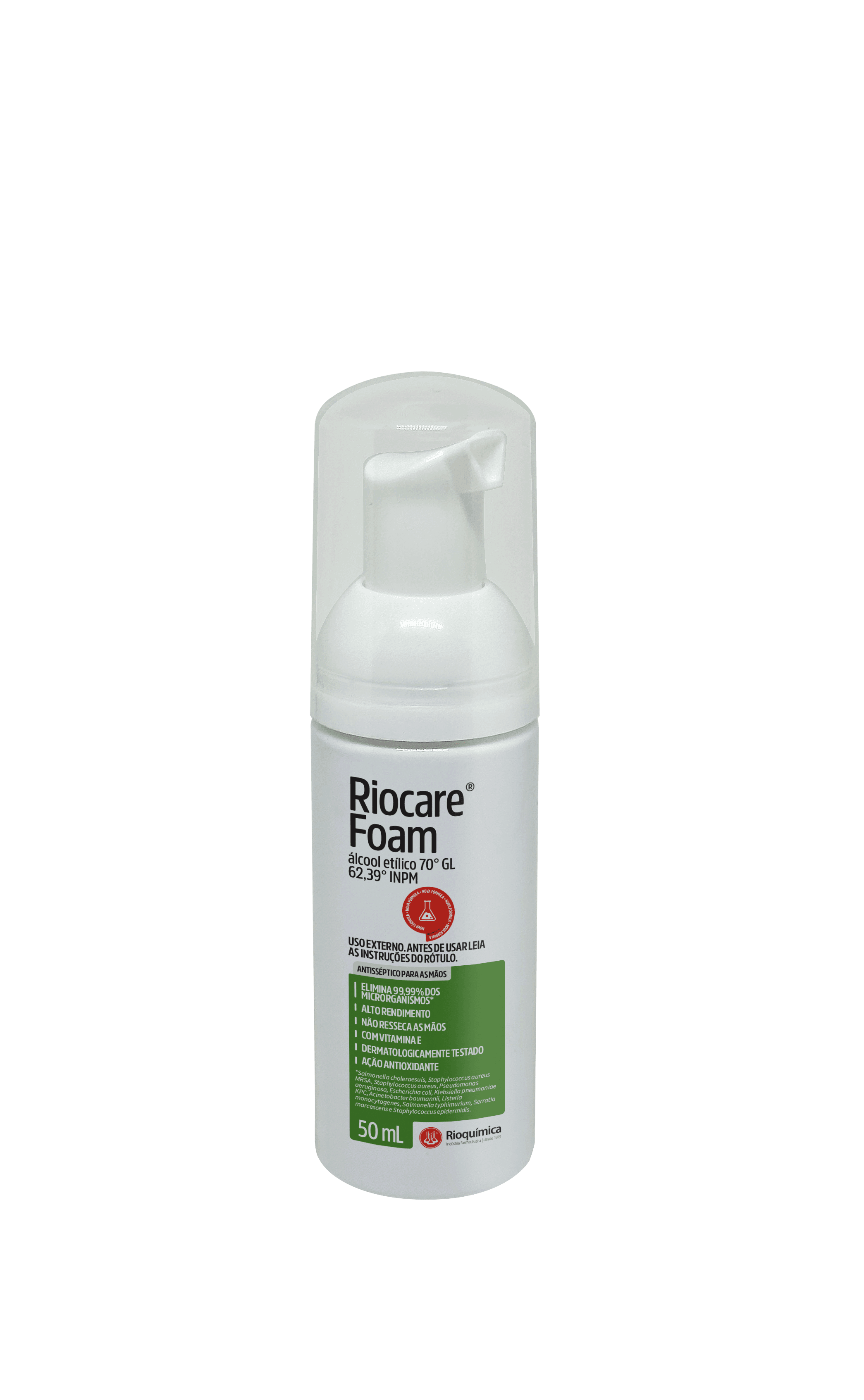 Álcool etílico 70% O Riocare Foam foi desenvolvido para a higienização das mãos e antebraços com fnalidade antisséptica. Possui ampla atividade antimicrobiana. Sua formulação exclusiva contém emolientes que proporcionam um toque suave e uma sensação de hidratação prolongada, além de espalhar facilmente. ALTO RENDIMENTO SEM DESPERDÍCIO Espuma Rende mais; Econômico e de alta qualidade; Oferece uma maior cobertura das mãos; Mais agradável ao tato. Eficácia contra Candida Auris COMPOSIÇÃO EM PORTUGUÊS: Álcool Etílico Água Propileno Glicol Peg-10 Cocamidopropil Betaína Triglicerídeo Caprílico/Cáprico Acetato De Tocoferila Álcool Isopropílico Óleo Da Folha De Melaleuca Benzoato De Denatônio