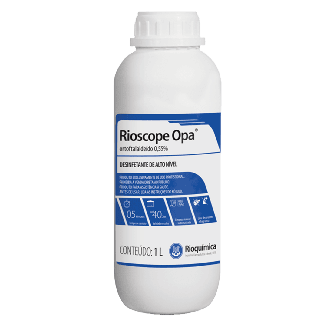 O Rioscope Opa® é um desinfetante de alto nível para artigos semicríticos, pronto uso, isento de corante e essência, com pH neutro indicado para o processamento de artigos odonto-médicohospitalares sensíveis ao calor. Indicado para utilização em sistemas manuais (cubas ou recipientes) e sistemas automatizados de desinfecção. Solução pronto uso. pH neutro. Não corrosivo. Biodegradável.